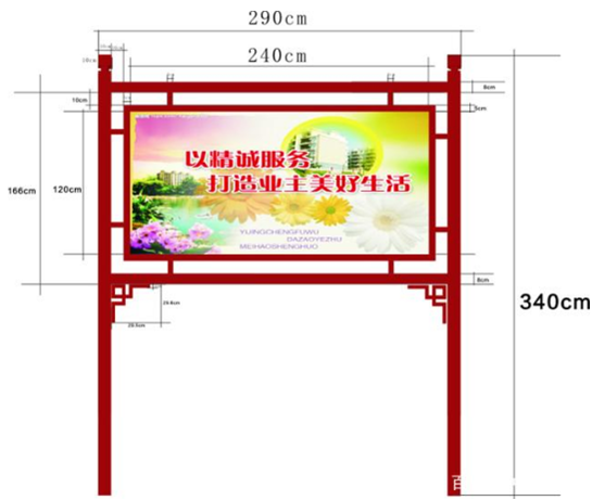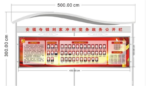 ?③黨政或小區(qū)大型宣傳欄的高度一般在兩米二以上,可帶頂棚,也可不帶頂棚,不帶頂棚的可以稍矮一些。頂棚材質(zhì)多為陽光板,也可是玻璃,或不銹鋼板。其寬度一般在兩米五左右,也有豎版的公告欄,寬度在一米左右。制定宣傳欄的寬度時(shí)應(yīng)考慮公告欄內(nèi)部放置內(nèi)容的尺寸,寬度一般是海報(bào)寬度的整數(shù)倍,再加十幾公分,這樣能夠利用宣傳欄的宣傳空間。單元宣傳欄的寬度一般在一米以內(nèi),橫版的較常見一些。常用規(guī)格如600mm*800mm