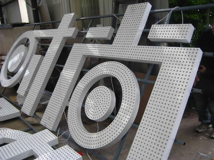 外露發(fā)光字燈之間的距離大,或者是少,會影響排列燈的數(shù)量,燈具與安裝的高度,以及字體的大小有關(guān),像樓頂上的5-6米的字,沖孔的距離就是在3mm左右,像門頭上的小字,一般的沖孔距離是2.5cm,沖孔的距離在沖孔軟件里面自動的生成。有些筆畫可能看著少了一點(diǎn)點(diǎn),有些是會密度高了一點(diǎn),不過間距都是不變的。每一個(gè)平方字都是有幾百個(gè)孔,人工排孔的話工作強(qiáng)度太大了,都是電腦軟件自動的打孔。像有些是幾百平方的發(fā)光字,打孔的數(shù)量都是在幾萬個(gè),排列孔,以及打孔都是需要電腦控制,機(jī)器操作,這樣才能夠沒有失誤。